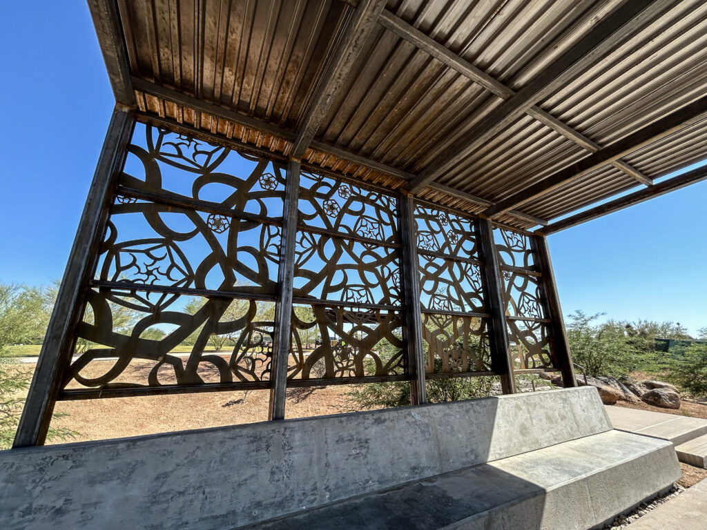 “Potentilla” utilizes Neubauer’s inspiration of a jali — a perforated stone or latticed screen commonly found in the architecture of India — to produce cooling breezes, using modern metal designs that are effective in the Sonoran Desert environment.